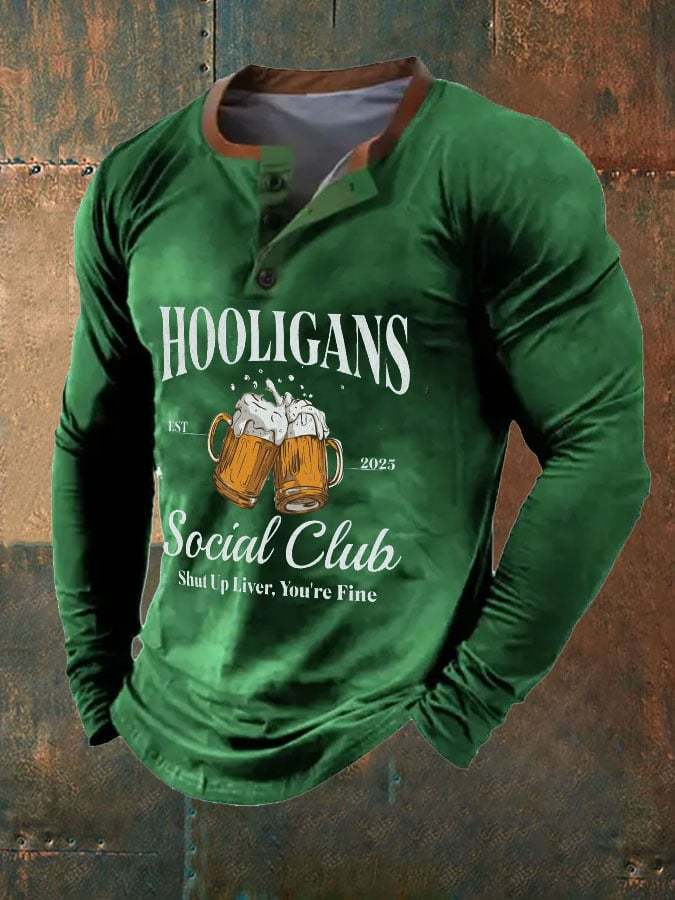 Men's St. Partrick’s Day Shamrock Hooligans Social Club Shut Up Liver You're Fine Casual Long-Sleeve Buttons T-Shirt