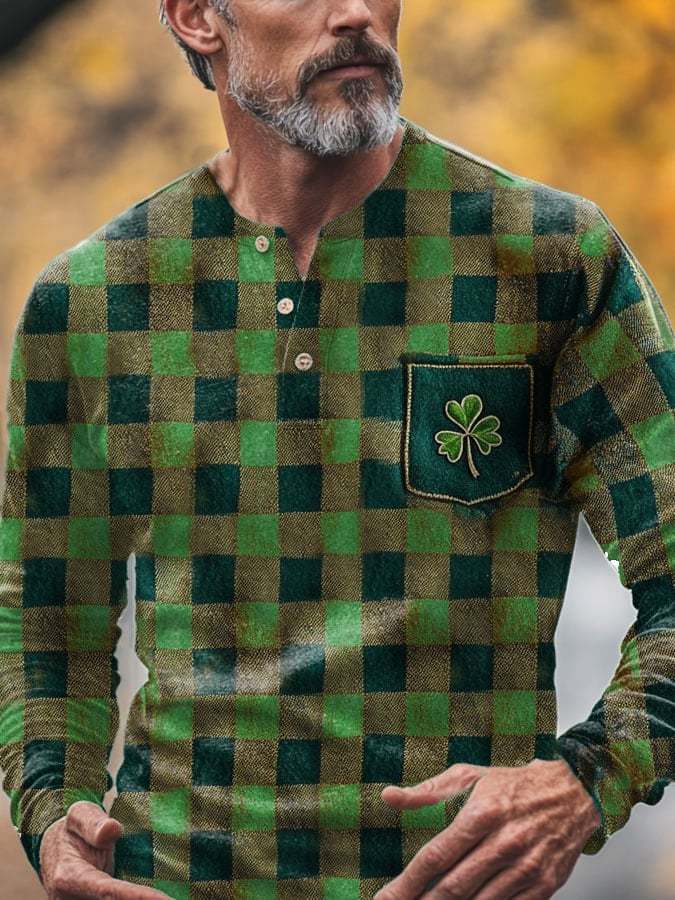 Men's St. Patrick’s Day Shamrock Plaid Shamrock Casual Long-Sleeve Buttons T-Shirt