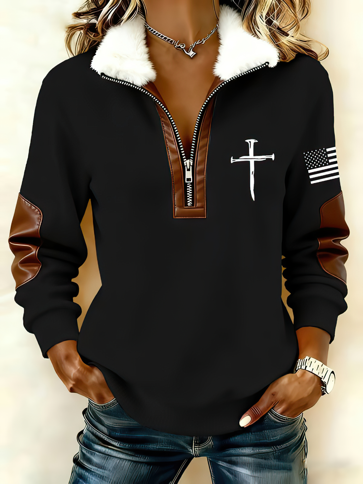 Women's Casual Retro Faith Print Patchwork Fur Collar Long-Sleeve Sweatshirt