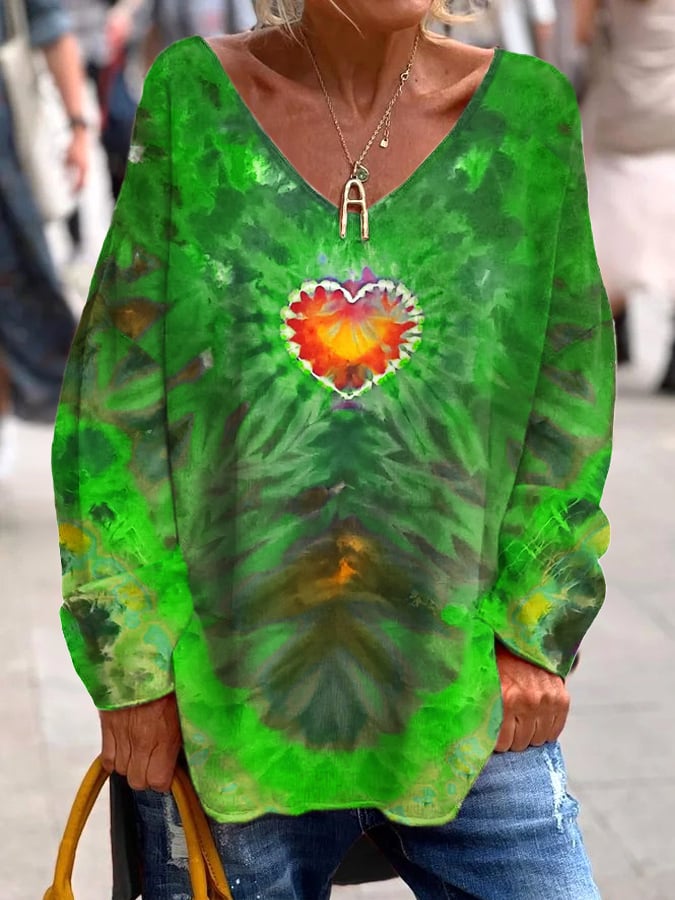 Women’s St. Patrick's Day Tie Dye Love Print Casual V-Neck Loose T-Shirt